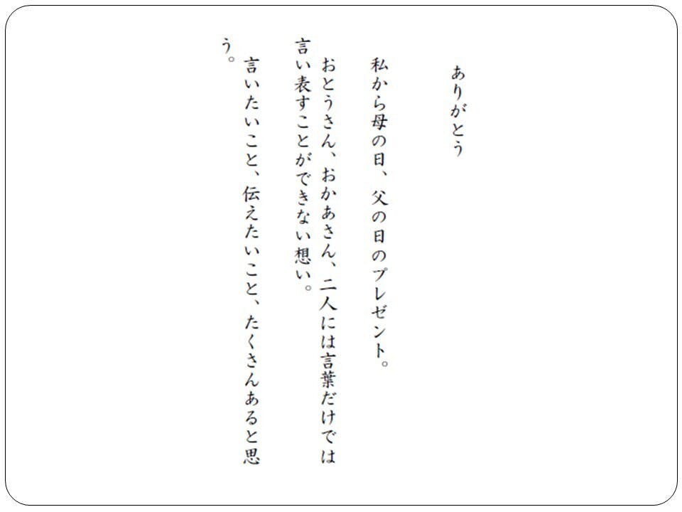実現したいことは、私の実体験をもとに、「ありがとう」という想いを伝える人を増やすことです。企画内容は、大切な人に「ありがとう」の想いを伝えたい方に、私がインタビューをします。インタビューをした内容をもとに文字におこし、文章の確認をして頂きます。その後、製本し大切な「想い」が書かれている手紙のような本をお届けします。