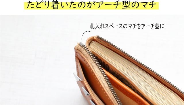 マチをアーチ型にすることにより、紙幣が奥まで突き当たるように。縫い目による余分な障壁が生まれません。