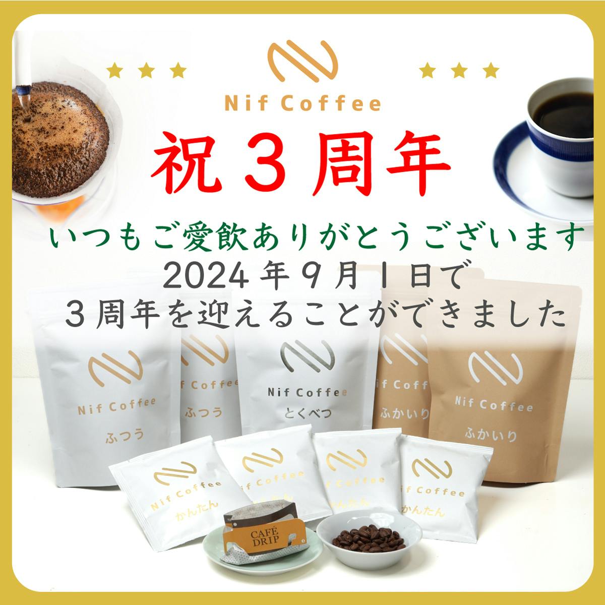 2024/09/06 11:242024年9月1日でNif Coffeeは開業3周年を迎えることができました。多くのコーヒー好きの方々に支えられての3周年です、改めてお礼申し上げます。Nif Coffeeではこの度3周年を記念しておよそ20%もお得なセットをご用意致しました。今のNif Coffeeを丸ごと楽しめてお得なセットです。ご興味ありましたら、商品詳細ページを御覧ください。どうぞ今後もNif Coffeeをよろしくお願いします。3周年セット商品ページhttps://nifcoffee.co.jp/view/item/000000000038<3周年セットの内容>ふつう:160g×2個(シティロースト)ふかいり:160g×2個(フレンチロースト)とくべつ:160g×1個(産地、焙煎度合いは時期により変わります)かんたん:12g×4個(ドリップバッグ:シティロースト)https://nifcoffee.co.jp/view/item/000000000038 もっと見る