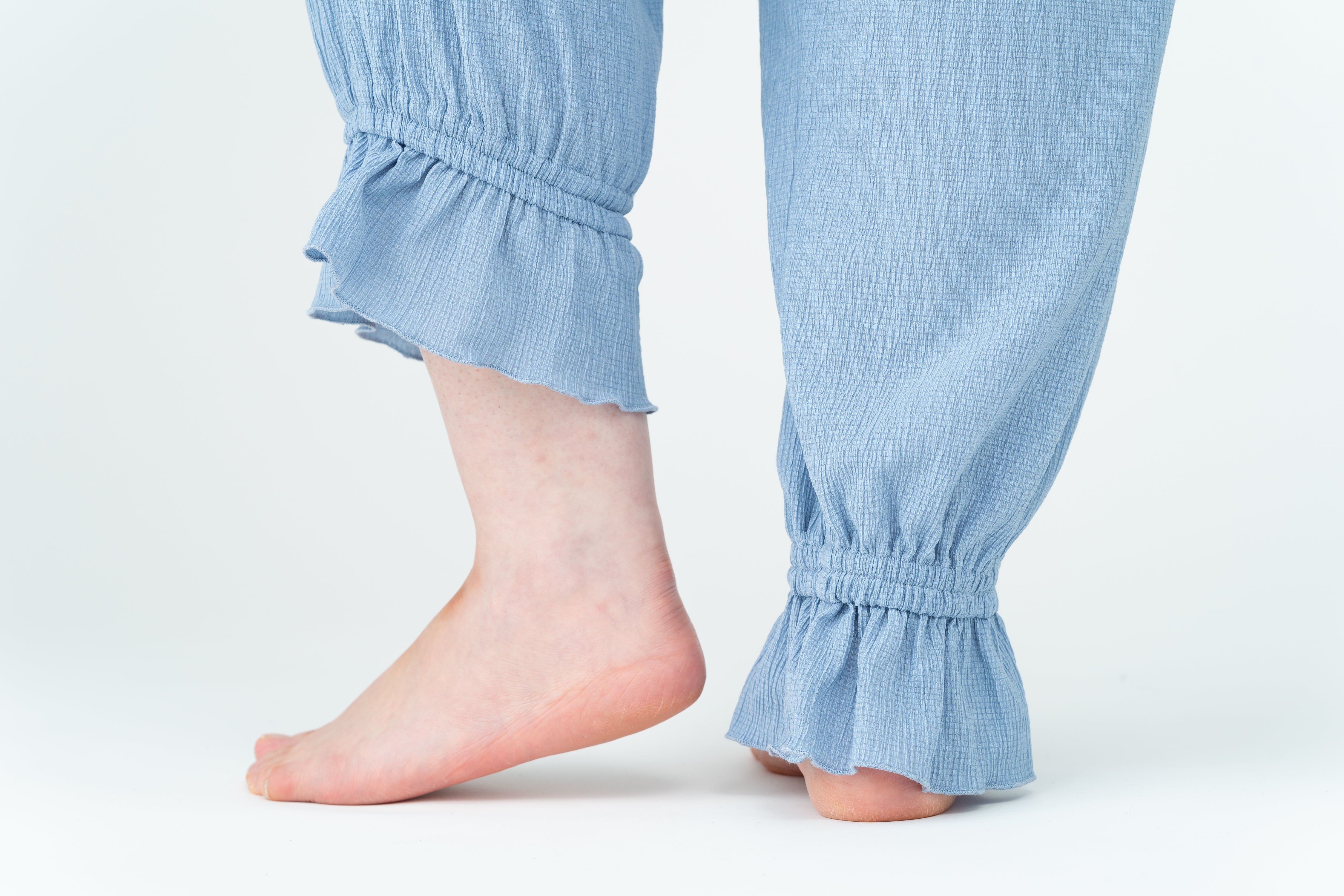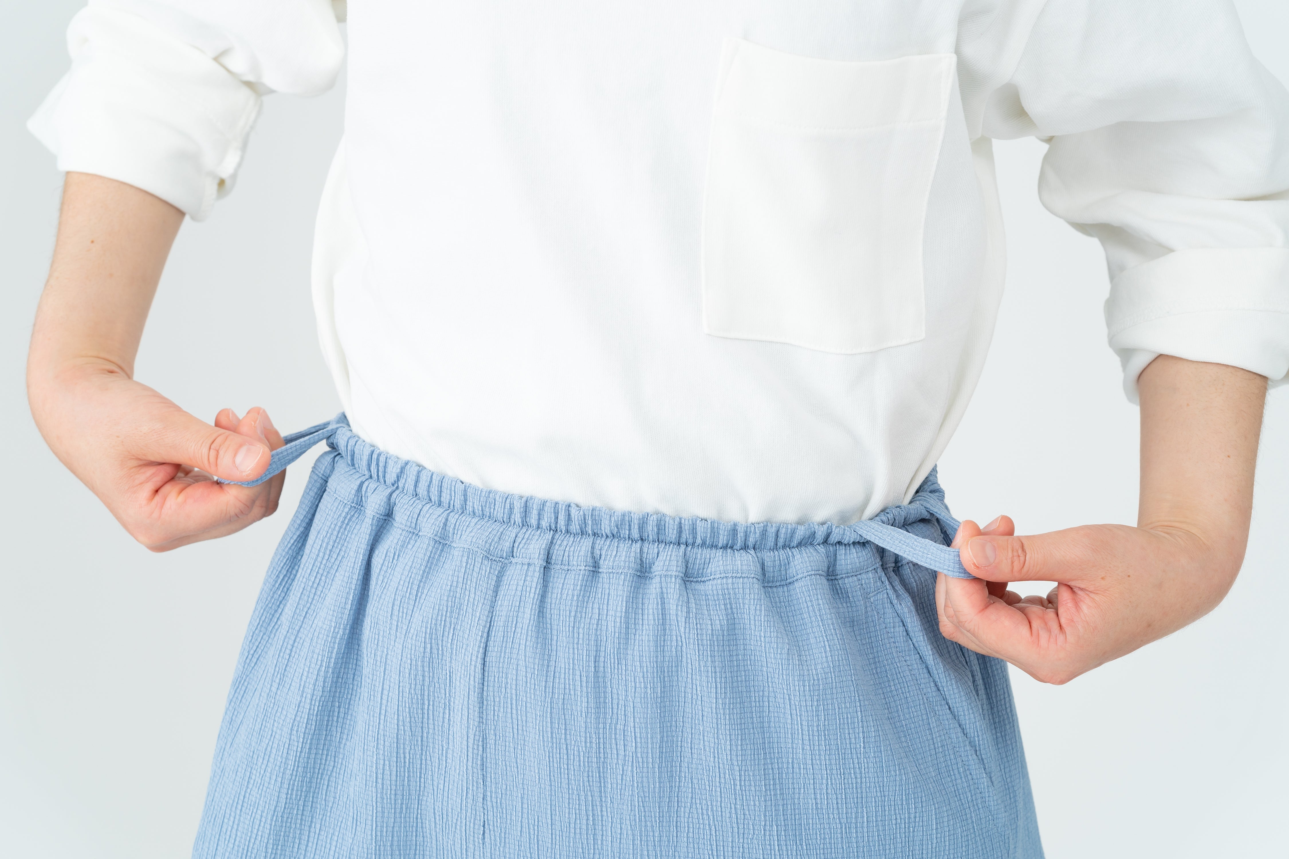 パンツの裾にはギャザーを効かせて。おしゃれにこだわりつつ、「脱いでも裾が床につかない」「めくれ上がらないから足下が冷えづらい」「裾が広がらないから足下がよく見える」といった機能性も重視しました。ウエストのゴム部分はかたすぎず、ゆるすぎずのちょうどいいバランスを追求。締め付け感のない履き心地で、長時間快適です。