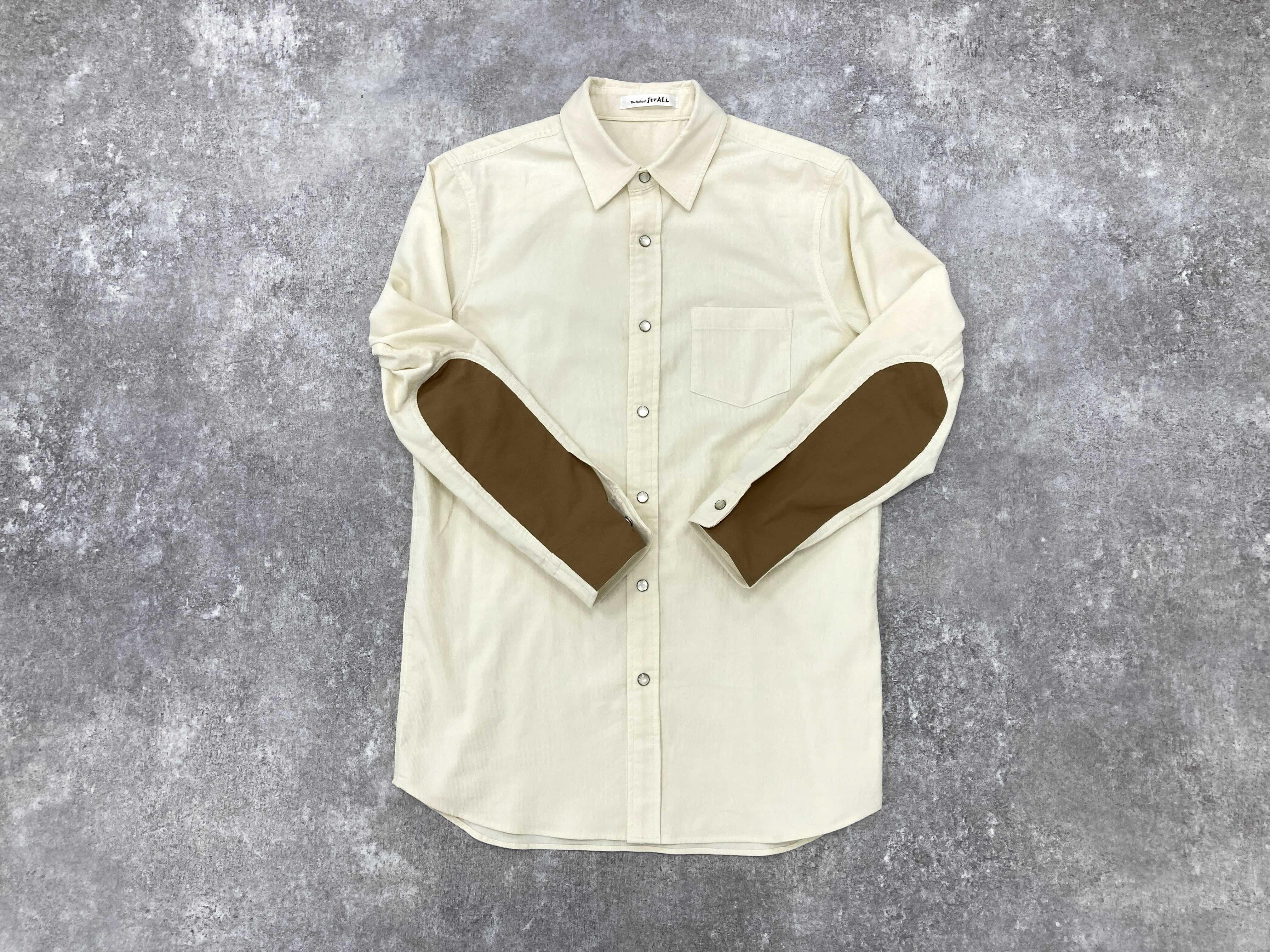カッチリカジュアルに着こなせるよう、細身シルエットのシャツに。パーカーと同様、リネンコーデュロイシャツの内側にもバイカラーの肘あてをプラスしています。