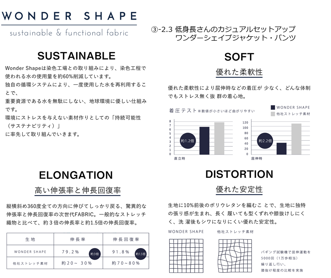 ジャケット、パンツにストレッチ素材「WONDER SHAPE(ワンダーシェイプ)」を 採用。手足の可動域が限られる制約があっても脱ぎやすく、着やすい工夫を凝らしています。