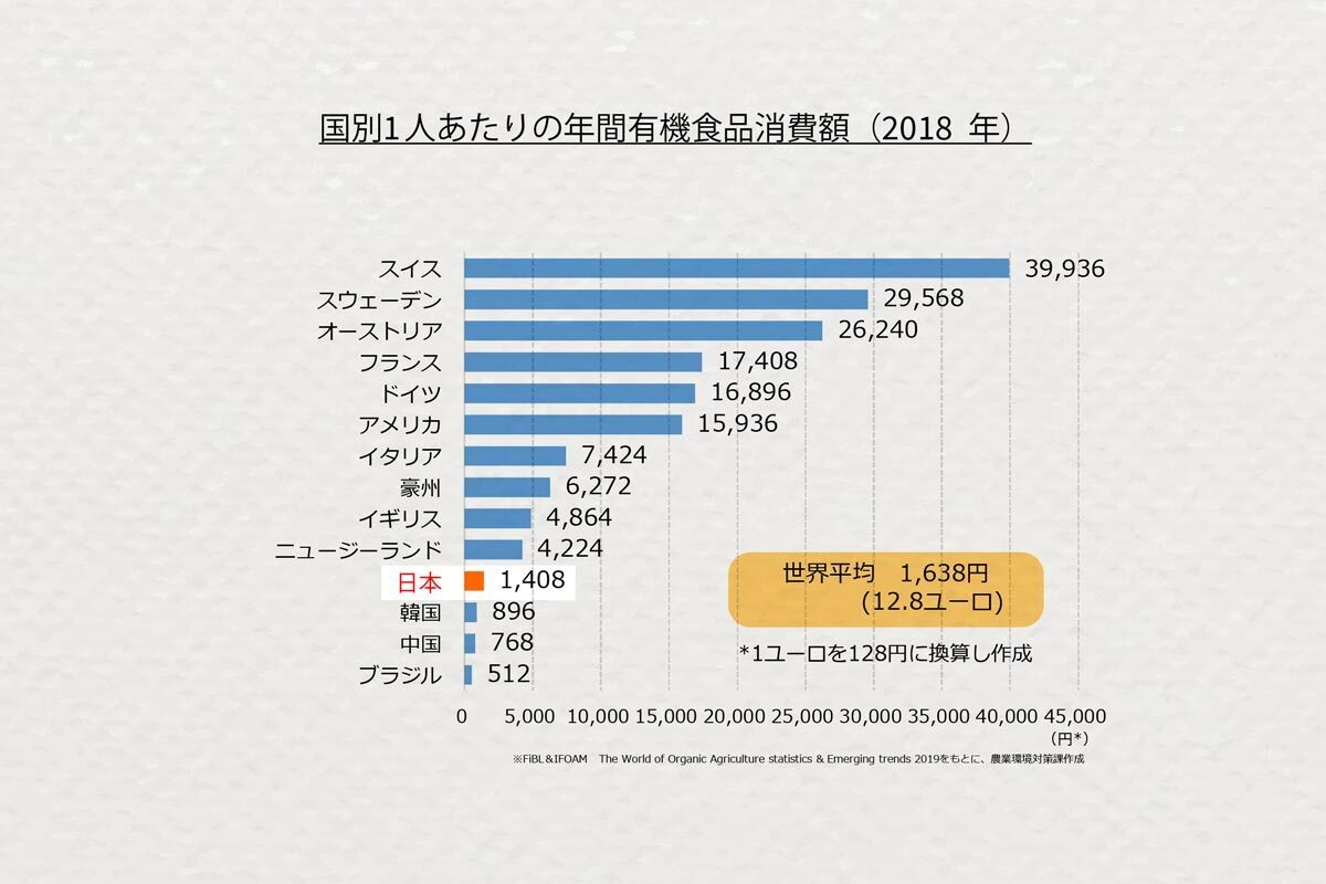 一方、日本人の一人当たりの国民がオーガニック商品の消費に使う金額はたったの年間、1408円。