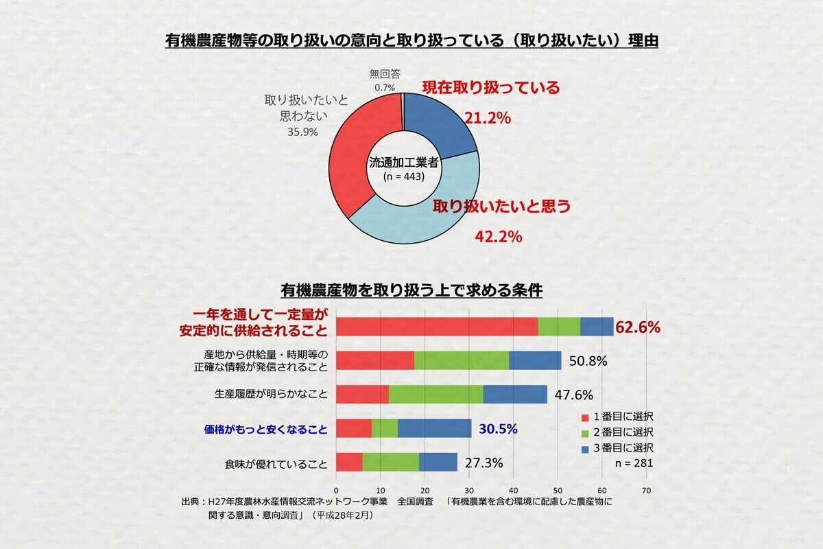 労力やコストがかかる割には、「オーガニックは高い」と叩かれることを恐れ、市場で安売りをした結果、期待していたほど収益を得られず途中で断念してしまう生産者が多いという問題が、浮き彫りになっています。