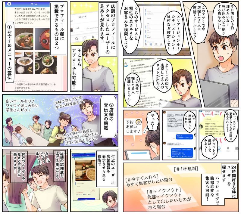 ここでどのようなアプリかをわかりやすくイメージしていただく為に使用方法を漫画にしました。