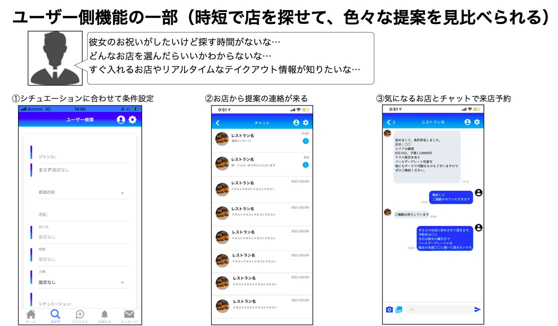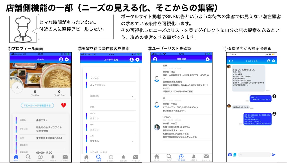 私はこのアプリで飲食店とユーザーを新しいカタチで繋ぐ事で、ユーザーには楽しんで頂きながら飲食店や飲食店を形成する周りの業者様(卸業者/清掃・ゴミ業者/看板/Web制作/内装業者/士業など)の取引先拡大でのサポートも可能になると考えています。