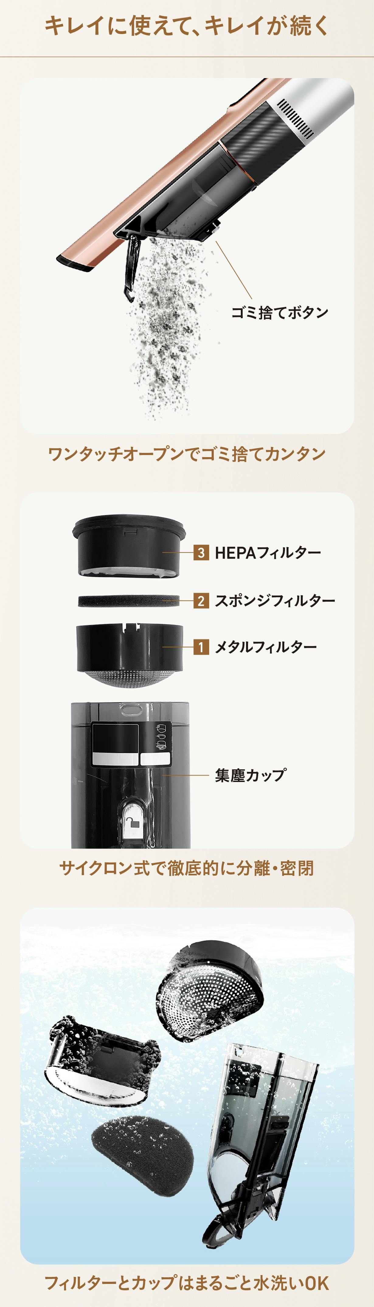 ■集塵カップ・フィルター水洗いOK、お手入れカンタン