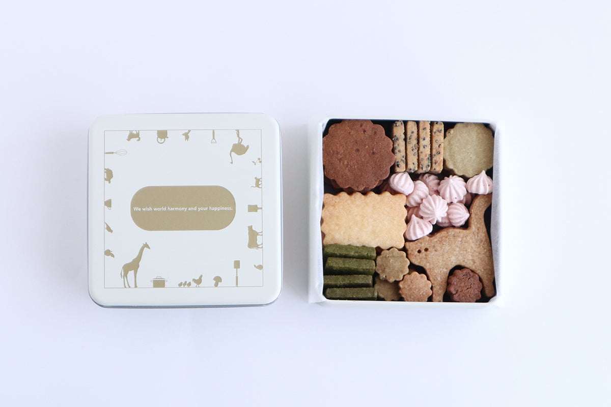 バターや卵など動物由来の素材を一切使わず、米粉をベースにつくったクッキー缶とのセットです。