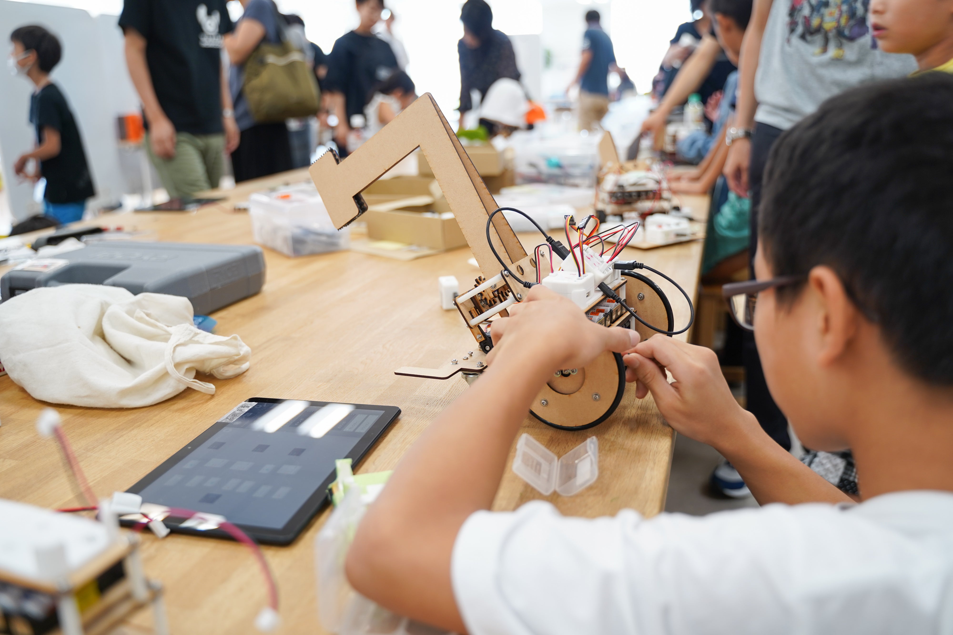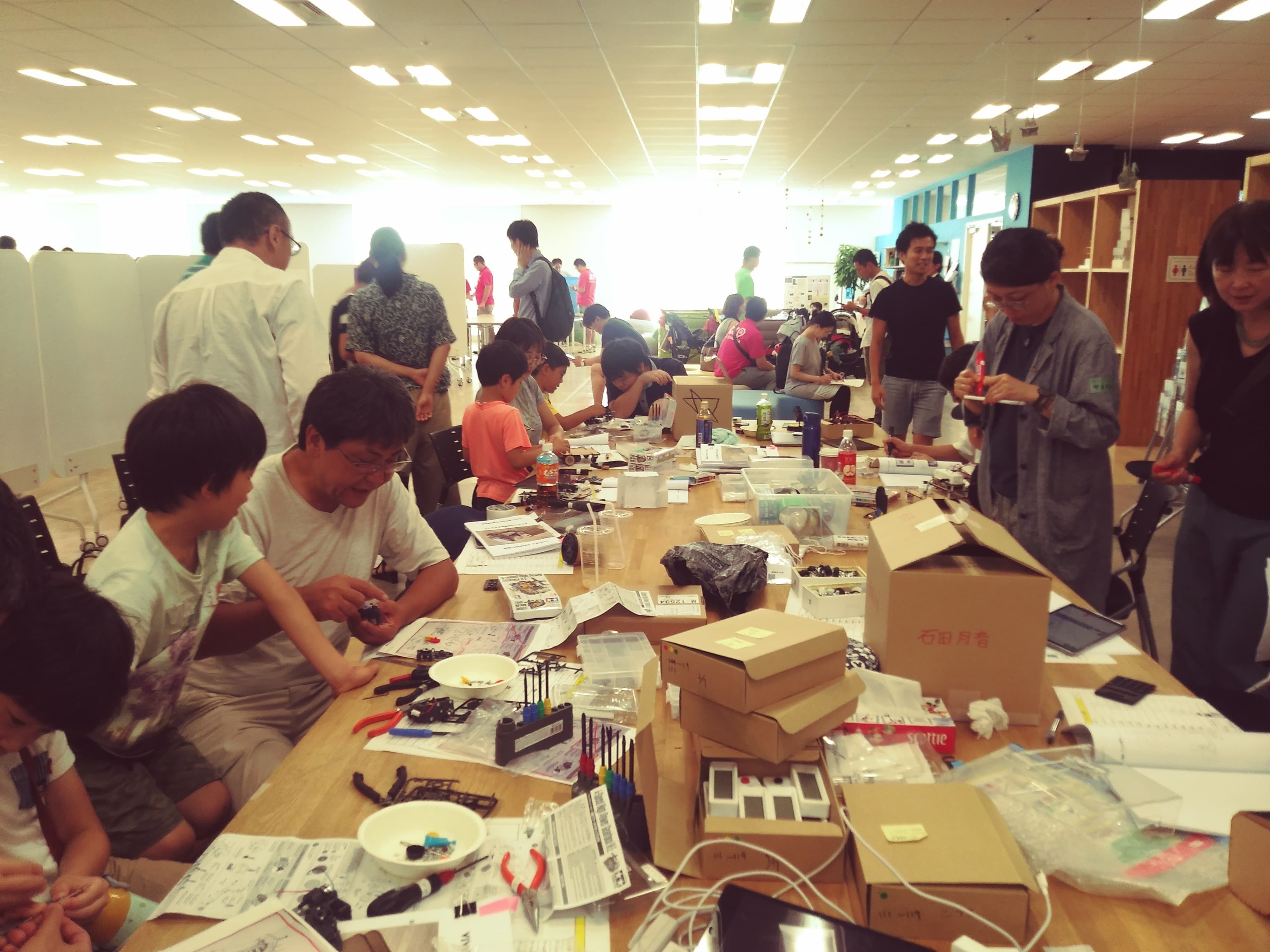 でも、決して、最初から意図したのではありません。主催者でありながら、私はロボット製作の知識も経験もなく、聞いたこともない部品や道具の調達にすら四苦八苦。しかも、読み書きや計算もままならない小学校1年生から中学生まで、参加者の年齢もバラバラ。進め方もやりたいことも一人ひとり違っていて、人も道具もぐちゃぐちゃ、という状況になってしまったのです。