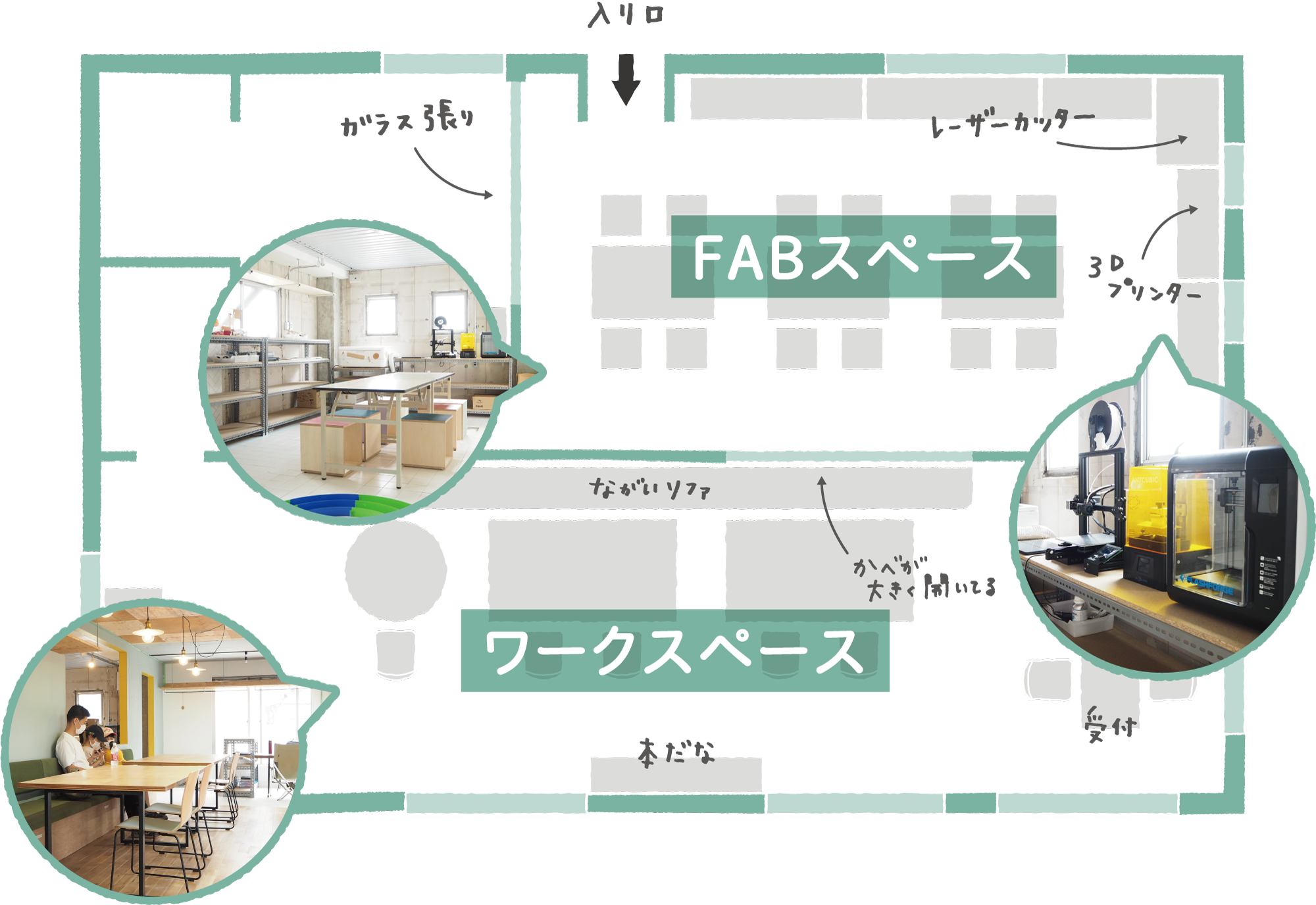 シモキタFABコーサク室には、「FABスペース」「ワークスペース」「工芸室&マテリアルベース(準備中)」があります。