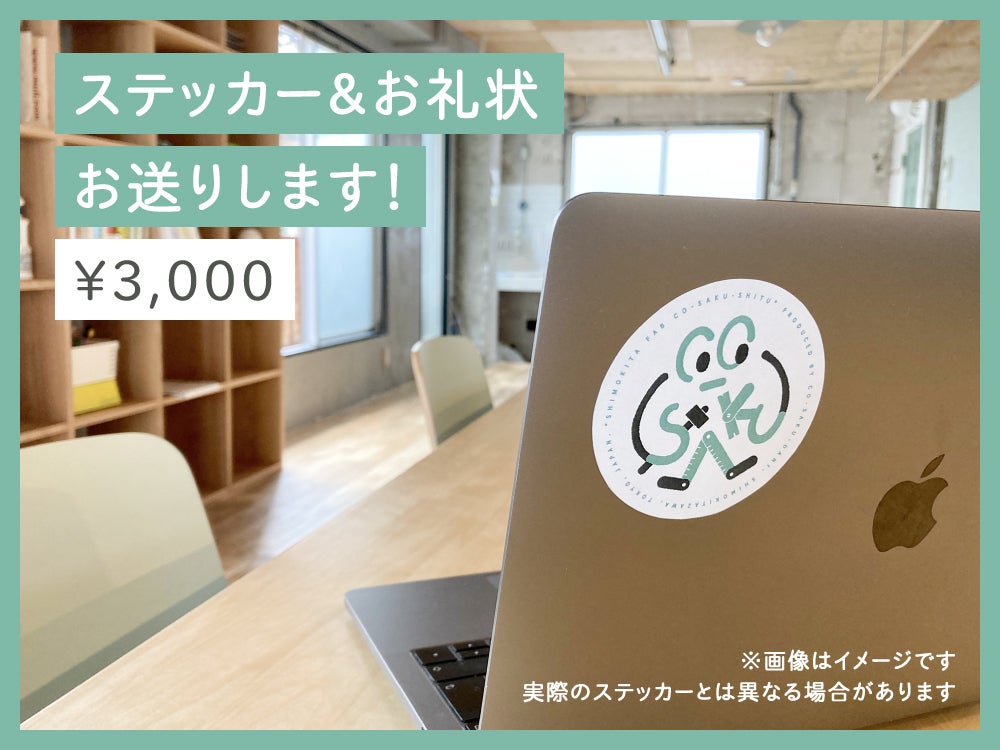 シモキタFABコーサク室を、お好きな日程で、3日間ご利用いただけます(混雑時など、日程の調整をお願いする場合があります)。連続した3日間でも、1日ずつでもOK!さらに、お名前を刻印したオリジナルプレート(大サイズ)をコーサク室に飾ります。さらにさらに、オリジナルステッカーと感謝の気持ちを込めたお礼状をお送りします!