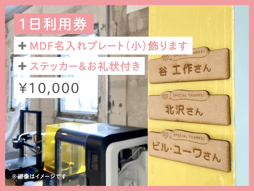 ●1日利用券+名入れプレート(小サイズ)飾ります+ステッカー&お礼状付き(対象:大学生以上)