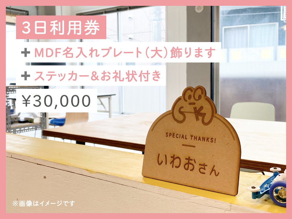 ●3日利用券+名入れプレート(大サイズ)飾ります+ステッカー&お礼状付き(対象:大学生以上)