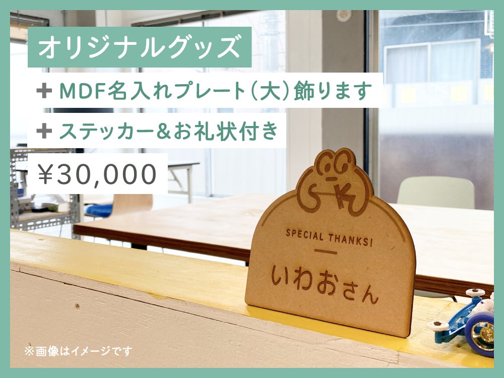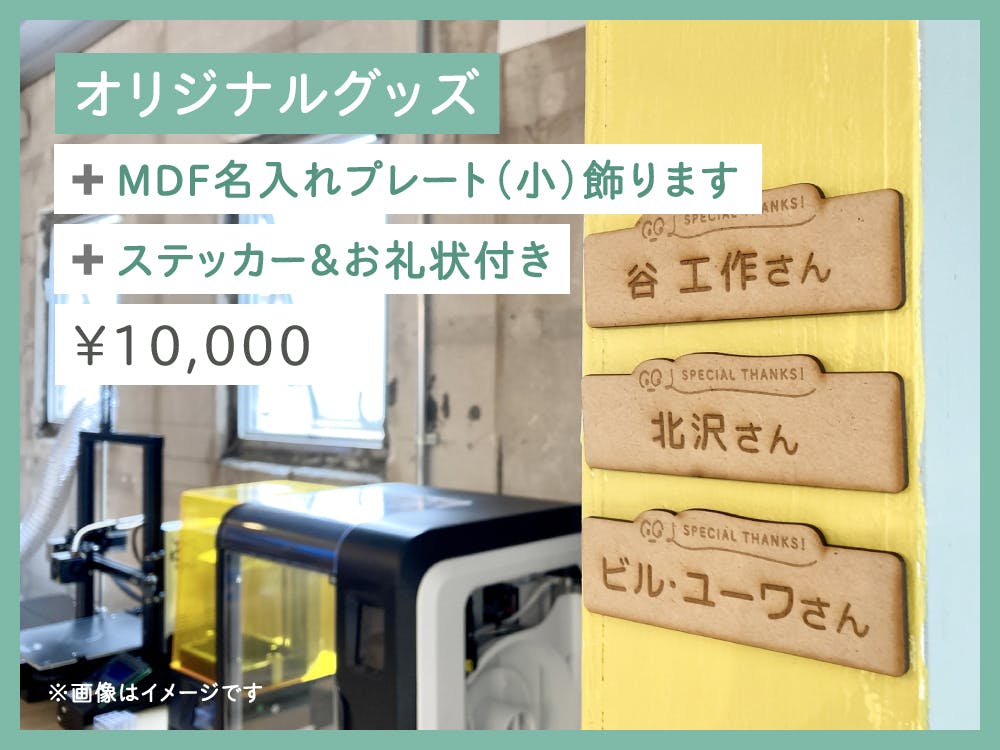MDFで作ったプレート(小サイズ)に、レーザーカッターでご支援者のお名前(ニックネーム)を刻印。そのプレートはコーサク室内に飾らせていただきます。ご支援者本人に直接お会いできなくても、いつも感謝の気持ちを持って、コーサク室を運営していきます。さらに、シモキタFABコーサク室オリジナルグッズ(ピンバッチなどを予定)とステッカー、そしてお礼状を送らせていただきます。