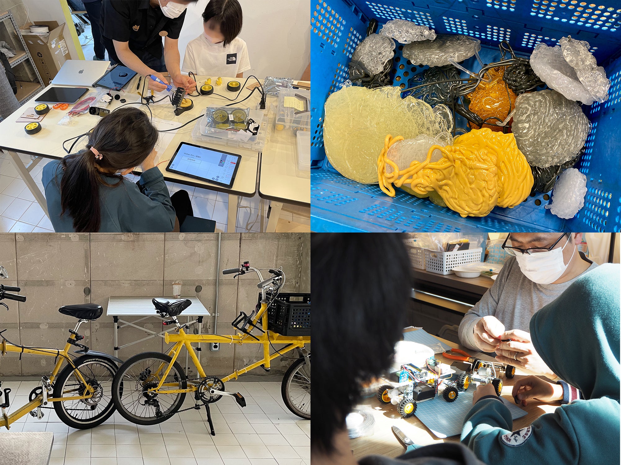 子どもたちやメカ好きのお父さんには、市販のキットや電子ブロックなどを活用した電子工作が人気です。たとえば、タミヤのバギーカーを改造して電子ブロックMESHで動かす「オヤツ争奪バギーカーレース」。性能もデザインも、ちょっとした工夫や部品を変えたりすることで、どんどん個性豊かなものになっていきます。