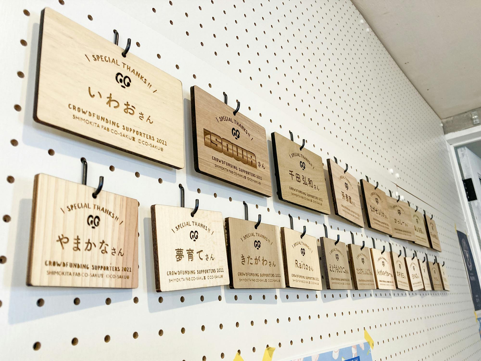 2022/01/21 14:21こんにちは。シモキタFABコーサク室の活動を応援いただき、ありがとうございます!昨年6月のオープンから半年が過ぎ、コロナ禍にふりまわされながらも、少しずつコーサク室でのものづくりを楽しんでくださる方が増えてきました。コーサク室の壁に、名入れプレートのリターンでご支援くださった皆さまのプレートが並びました。実はこのプレートに使っている木材、皆同じではありません。今回は、ポプラ、ホオ、カツラ、クルミ、キハダ、ブナ、ニレ、ミズキ、スギ、シナ、イチョウ、オニグルミの13種類を使用しました。木材の特徴によってレーザーカッターの出力(照射パワーやスピード)を微妙に変えています。たとえば、スギなどの柔らかい針葉樹だと一度のカットで抜けますが、家具などにも使われるブナでは、スギの倍以上の回数をかけてカットしています。このような調整は、正しい数値が示されているわけではなく、一つひとつ設定を変えて、試して、を繰り返し、いわば経験の積み重ね。プレート中央にあるCO-SAKU谷キャラの目の部分は刻印ではなく抜きになっていますが、素材によっては焦げてしまったり。コーサクダニのメンバーが、四苦八苦しながら、お一人おひとりの名前を記し、感謝の気持ちを込めて製作した力作です。プレートを掛けた壁は、入口ドアの正面。来室された方々に、真っ先に目に入るところです。木材なので、コーサク室で流れる時と共に、色や風合いが変わっていくことでしょう。どうぞこれからも私たちと一緒に、コーサク室を育てていただけますよう。お近くにお越しの際には、ぜひ、このプレートを見にいらしてくださいね。 もっと見る