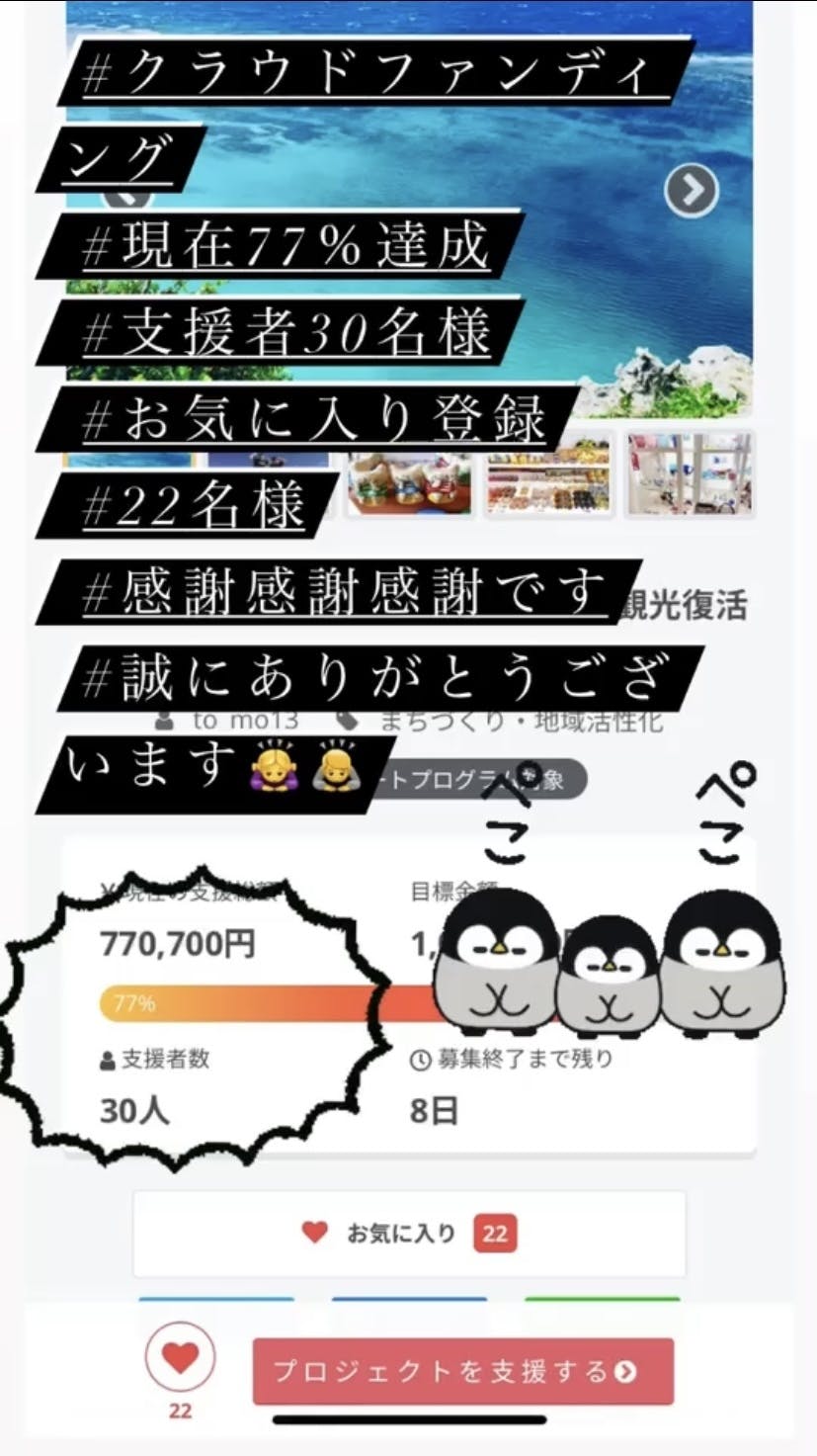 2021/07/17 13:40皆さまお世話になっております。今回はクラウドファンディングの中間報告をさせていただきます。現在皆さまからのご支援は770,700円です。ご協力いただきありがとうございます。ご支援とともに応援のメッセージや店に足を運んでいただいたり大変嬉しく思います。目標金額の100万円までもう少し‼︎クラウドファンディング期間終了まで全力で進んでいきますので最後まで皆さまのご協力を何卒よろしくお願いいたします。 もっと見る