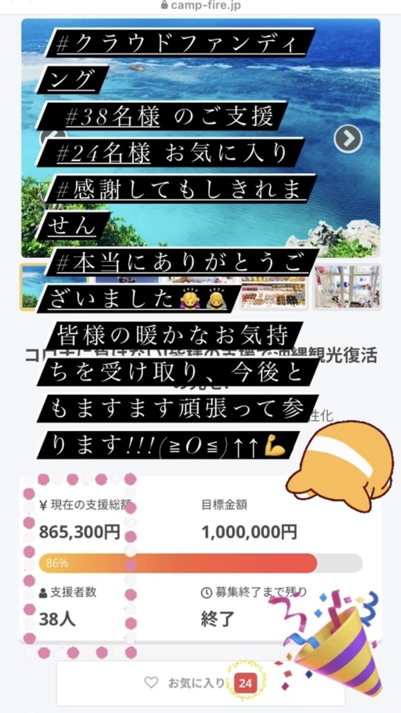 2021/07/27 16:59御報告させていただきます。7月25日を持ちまして、当プロジェクトのクラウドファンディングが終了致しました。クラウドファンディングの最終結果につきましては、下記の通りとなっております。総支援金額:865,300円(86%)総支援者数:38名様ご支援をしていただきました38名様に厚く御礼を申し上げますとともに、感謝の御報告とさせていただきます。クラウドファンディングに御支援をいただきました皆様だけでなく、直接店に足を運んでいただきました皆様、応援のメッセージやSNS上でシェア等をして下さった皆様、本当に多くの方々に心身ともに支えられました。心より感謝を申し上げます。皆様のあたたかなお気持ちを全力で受け取り、コロナに負けず乗り越えていけるよう頑張ります!!!この度は本当に、ありがとうございました。※リターン商品につきましては、準備が整い次第、順次発送とさせていただきますので、今しばらくお待ち下さい。 もっと見る
