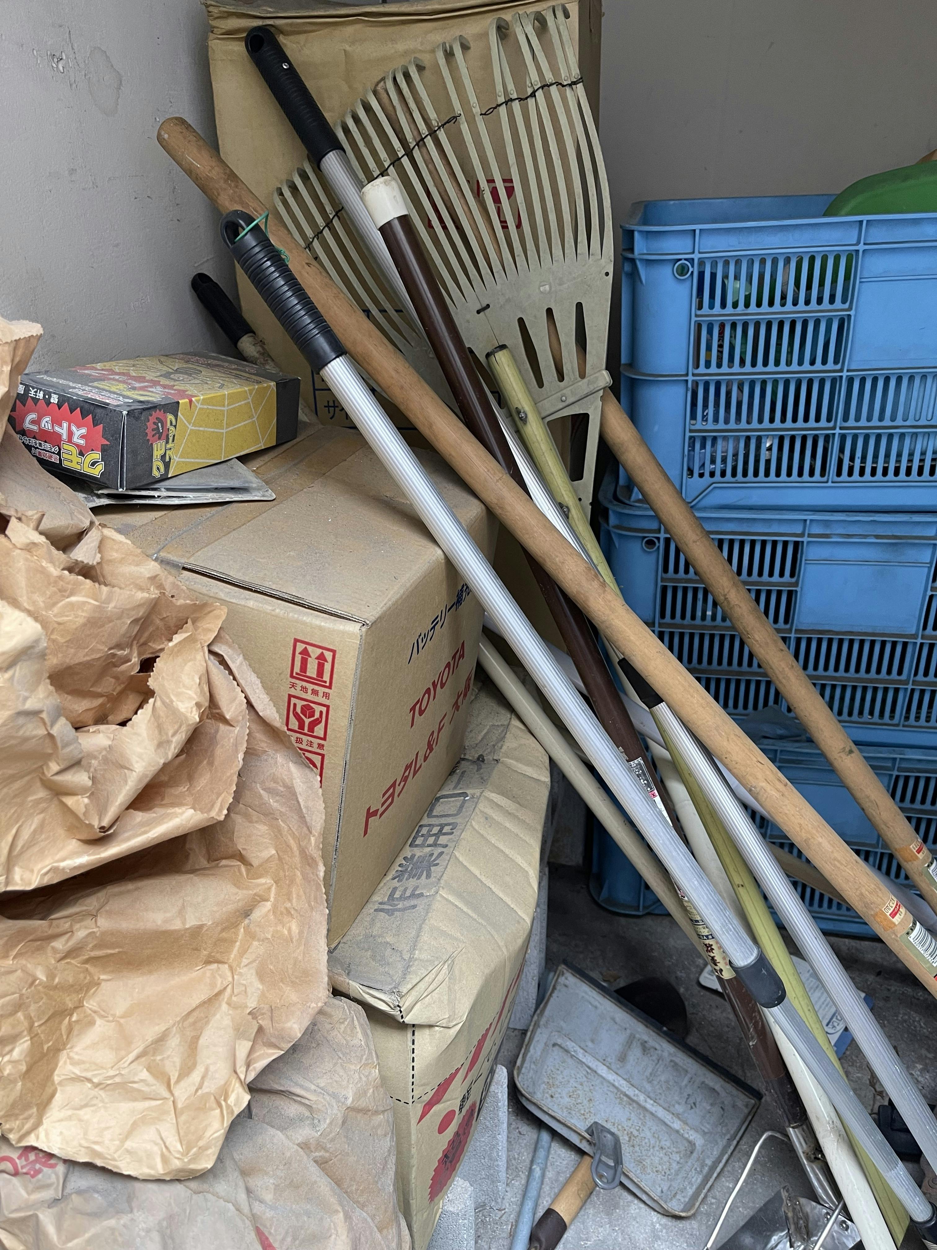 乱雑に置かれている、清掃用具、農機具、工具類などを