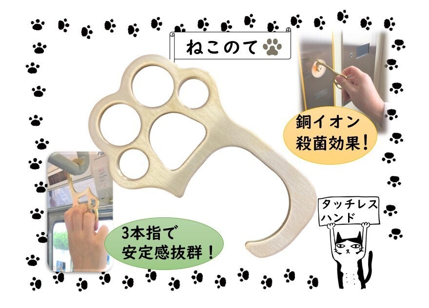 その日のうちに試作品ができ、デザイン等改良を何度か行い、真鍮(しんちゅう)製のドアオープナー『タッチレスハンド』ができあがりました。