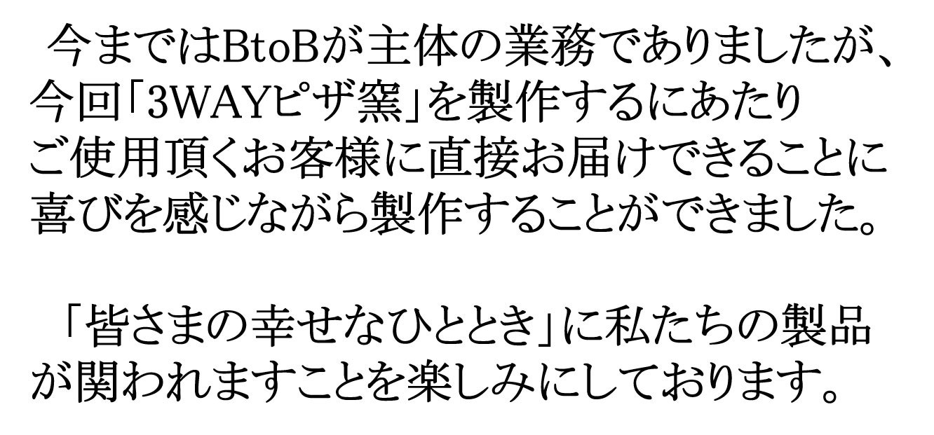今回「3WAYコンパクトピザ窯」をご使用いただくことで、親子・ソロキャンパー・キャンプ初心者など多くの方に喜んでいただき、製造を担う自社の社員の笑顔も増やせたら嬉しいです。