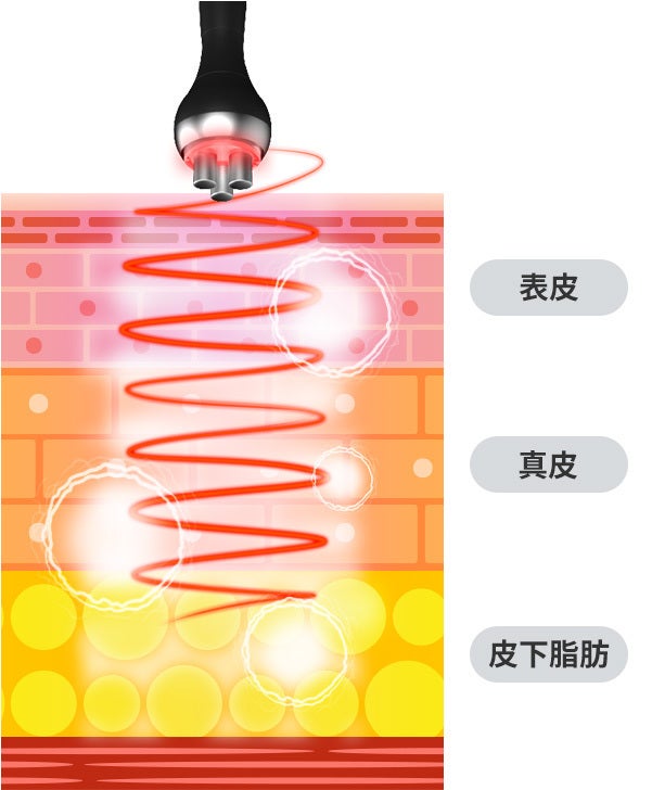ラジオ波は深部まで温熱効果をもたらし血行促進し、体の深層体温を上げることでその後の施術の効果を高めます。さらに柔らかくなったセルライトを流しやすくし排出を促します。レッド LED の光で肌に潤いと弾力を与えながら、基礎代謝を高め、お肌のハリも UPできます。