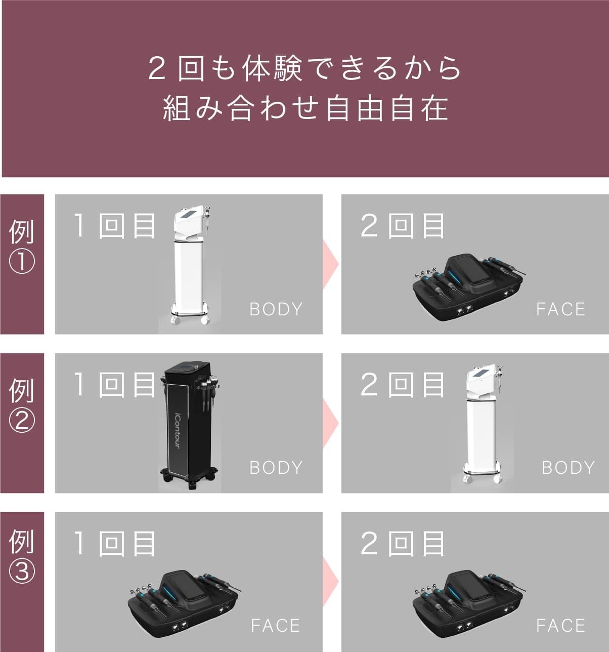 A.自分自身でエステマシンをご利用できるサービスです。使用できるエステマシンは、高級エステサロンで使用されている1台5役(キャビテーション/ラジオ波/吸引/ポレーション/LED)の高技術を搭載した最先端のエステマシン「iContour」「iContourX」が全個室導入されています。フェイシャル専用マシン「iContour beaute」も半個室にて導入されています。