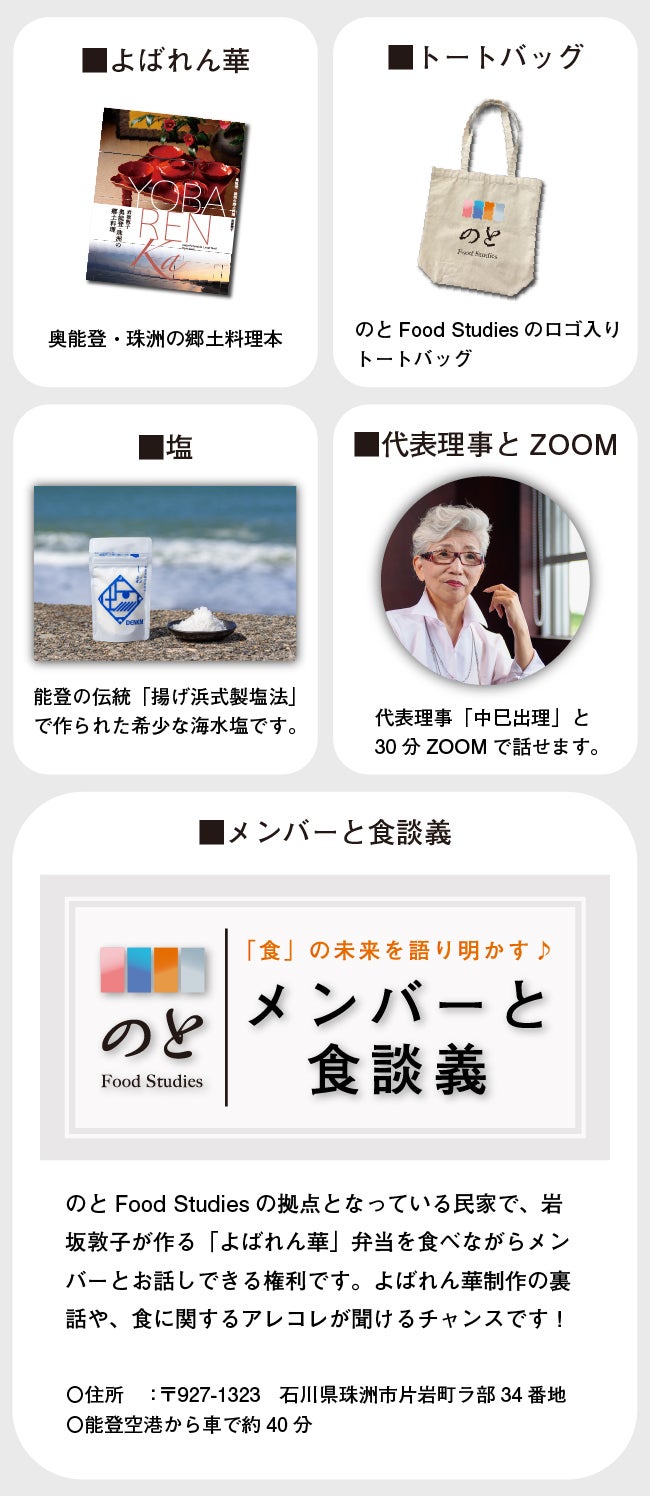 「よばれん華」の冊子以外にも、のとFood Studiesロゴが入った「トートバッグ」、奥能登珠洲で伝統技法によって作られる希少な「塩」、代表理事との「ZOOM対談」の権利、「メンバーと食談義」の権利といったさまざまなリターンが盛り沢山です。