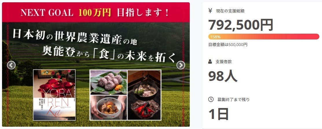 2021/08/30 16:14いつも皆様からの温かいご声援をいただき、誠にありがとうございます!「日本の食を変える」その合言葉を掲げ、始まった今回のプロジェクトも終了まで残り「1日」となりました。早いですね・・・当初の目標金額である「50万円」は無事クリアし、ネクストゴール「100万円」まではあと少し・・・。支援者様の数もあと少しで100人に到達しそうです!この私たちの取り組み・想いをさらに多くの方々に知ってほしいと思っています。日本の食の明るい未来を願ってこれからも日々奮闘してまいります。もし共感していただけましたら、SNS等でシェアしていただけたらすごく嬉しいです。どうぞよろしくお願いします。あとひと踏ん張り!日本の食文化をみんなで守っていきましょう♪ もっと見る