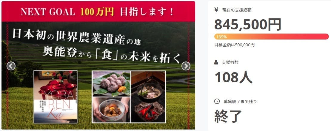 2021/09/01 09:41本日をもちまして、プロジェクトが終了致しました。本当にたくさんの方々からご支援いただき、大変うれしく思っております。ありがとうございました。当初の目標である50万円を超え、100名以上もの方々に応援していただけたことが、私たちにとって何よりの財産でございます。「日本の食を変える」そのために私たちは今後とも多くの方々に郷土料理・家庭料理の大切さを発信していきたいと思っております。改めまして、本当に皆様ありがとうございました! もっと見る
