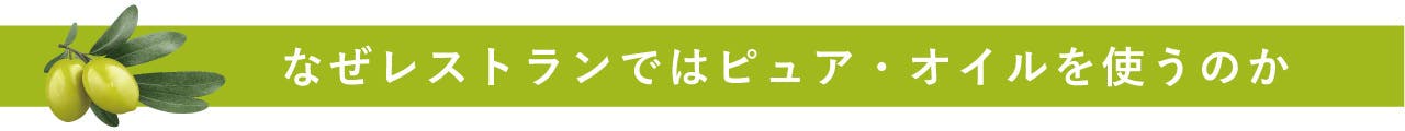 エキストラ・バージンオイルは搾油するときに加熱しない、いわばオリーブの果汁のようなものです。オレイン酸の他、ビタミンが豊富で、香りもとても良いものですが、調理に使う油としては他の油と比較してとても高価なものです。また、加熱すると風味が落ち、ビタミン類も破壊されてしまうので、加熱調理にエキストラバージンオイルを使うのはもったいないのです。そこでピュアオイルの出番となります。イタリア料理において加熱調理にあくまでもオリーブオイルを使う理由、それはオリーブオイルが蒸気化する温度が高く、加熱調理したものがカラッと仕上がるという事が挙げられます。また、揚げ油として使う際にもオイル自身が食材に浸透しにくく、表面に止まりにくいので油っこくならないのです。