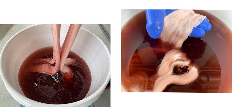 イチゴで染めることにより、化学染料の使用率が通常の染めよりも少ないので、排水負荷は通常の染めより少なくなります。