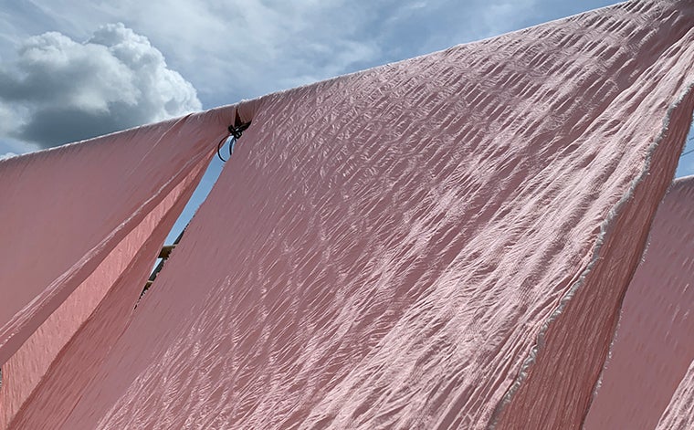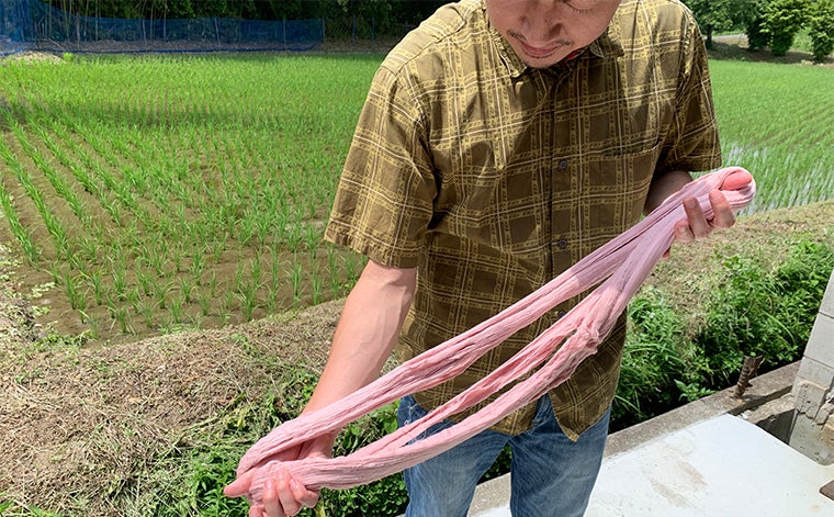まずは、従来通りの染色方法でイチゴ染めをして、どれくらいの濃度で染まるのかやってみたのですが、結果は、全く染まりませんでした。今までのやり方をしていてはダメ。新たな染料の作り方を試行錯誤し、何度もやり直しをしました。どうしても、播州産地にある設備でつくりたい。ここにあるものでどうやればできるのか、実験を重ねました。従来の工場で安定的に生産できて、商品として安全な堅牢度を保つ染め方とは何か。今までにないノウハウを生み出すことに挑戦したのです。