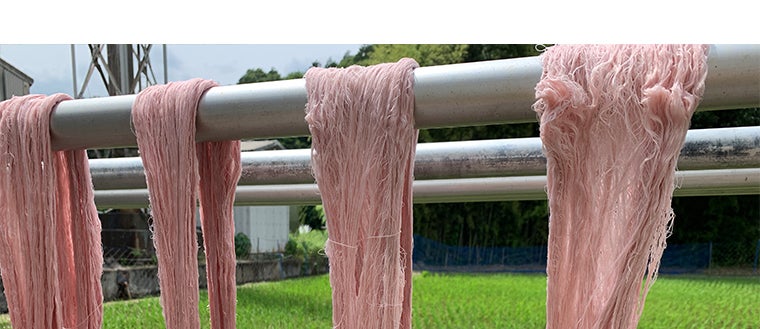 さらに、整経(=サイジング。生地を織る準備工程で、縦糸の必要な本数・長さ・張力などをそろえること。)の際に本来なら使用する糊を今回は使わずに作ります。糊を使わないことで、糊抜き剤のの必要がないのと、糸自身のしなやかさを活かす事が出来ます。