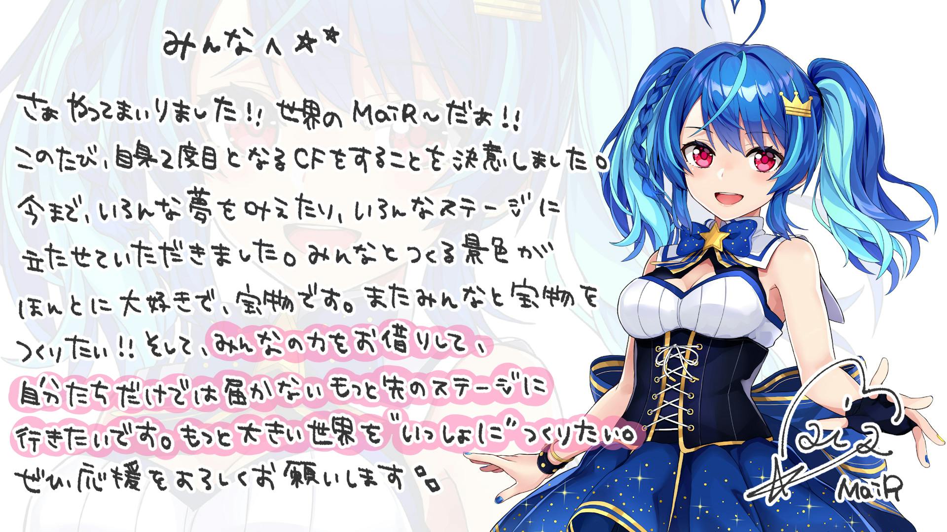 ファーストワンマンライブ「Merry Star Tours!!」から大きく成長を遂げたMaiRの歌やパフォーマンスを皆さまにお見せしたいです。ご支援のほど何卒よろしくお願い致します。