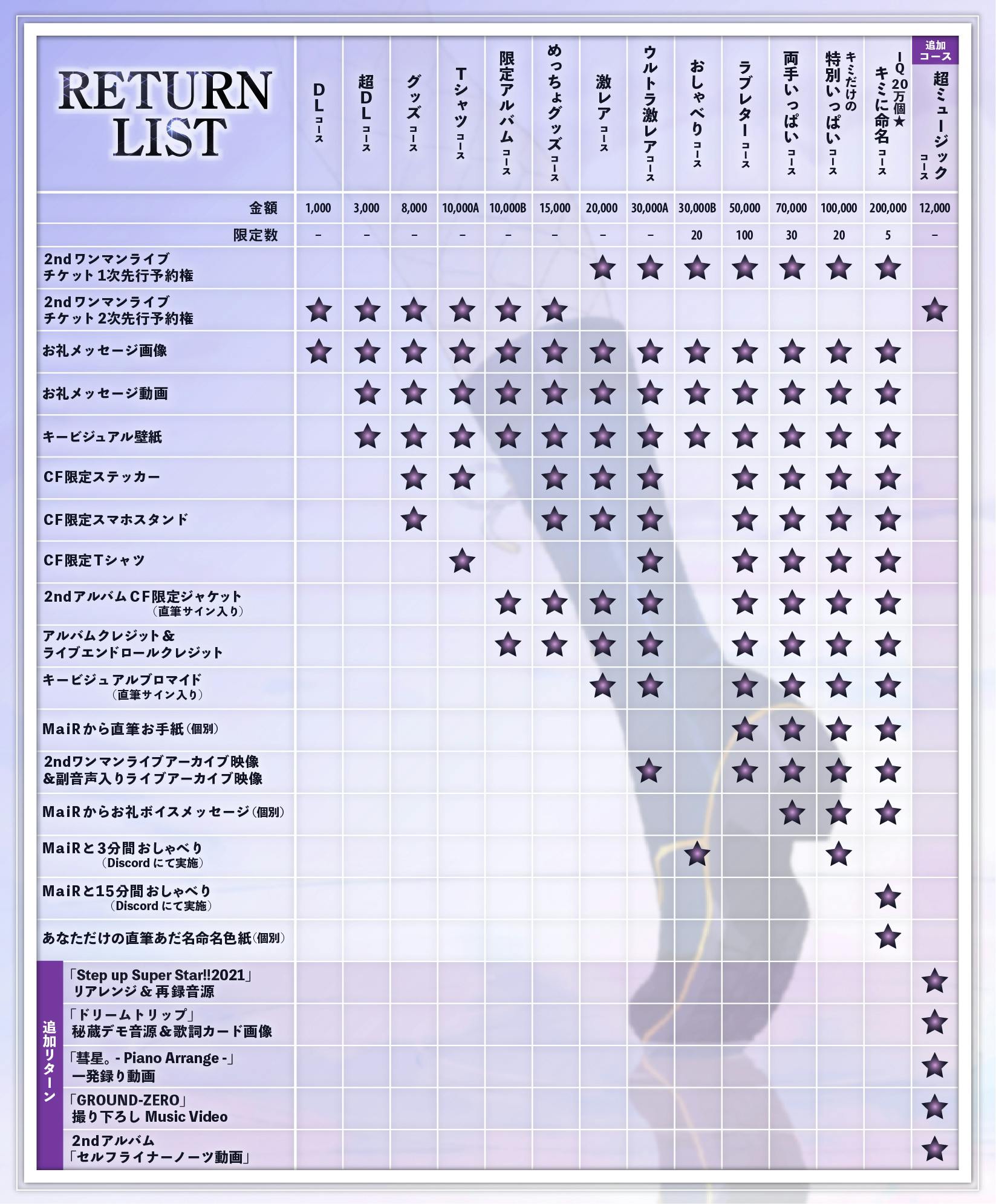 ※リターンの「2ndアルバムCF限定ジャケット(直筆サイン入り)」は支援者様限定ジャケット仕様のCDとなります。通常版CDはMaiRオフィシャルオンラインショップにて販売予定です。