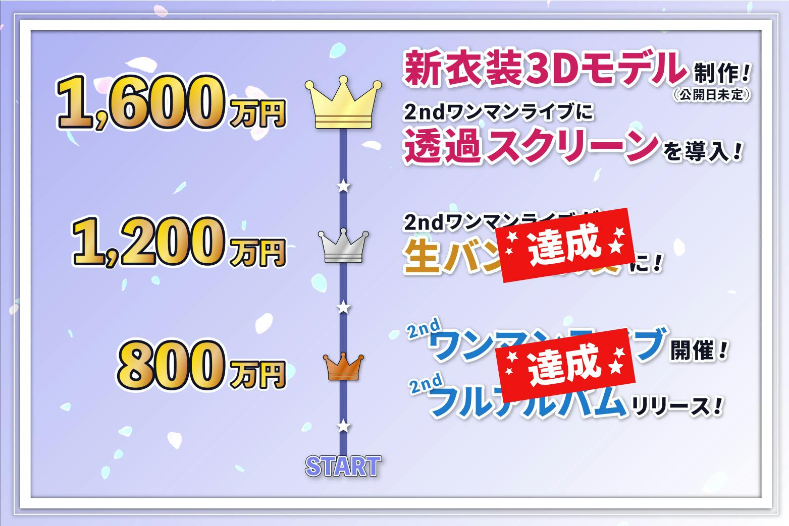 目標額200万円に対し、最終的には約800万円の支援を集め、ストレッチゴールとして初のワンマンライブ開催、新3Dモデル制作も達成した。