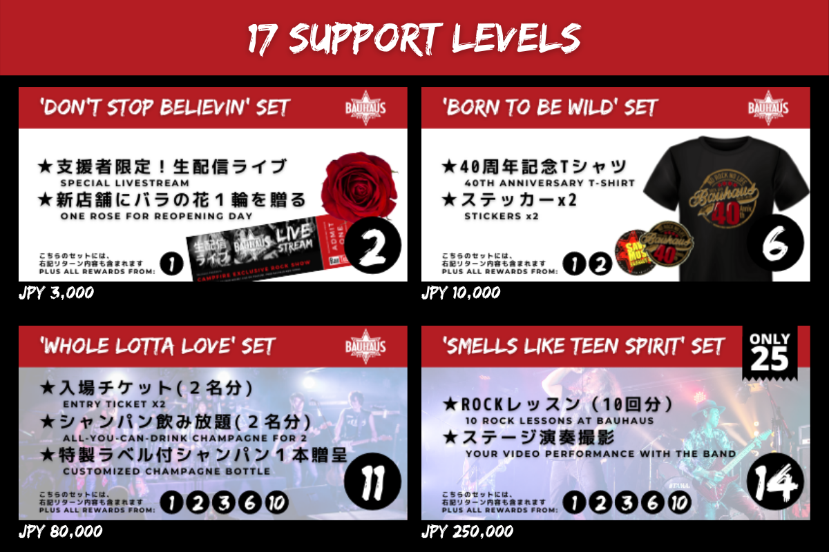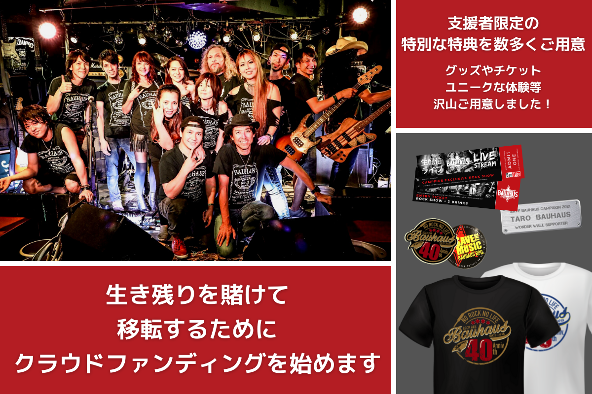 そのため、40年間皆様に支えていただいた『バウハウス』、そして音楽エンターテインメントの灯を絶やさないためにも、存続をかけてクラウドファンディングを立ち上げさせていただくこととなりました。
