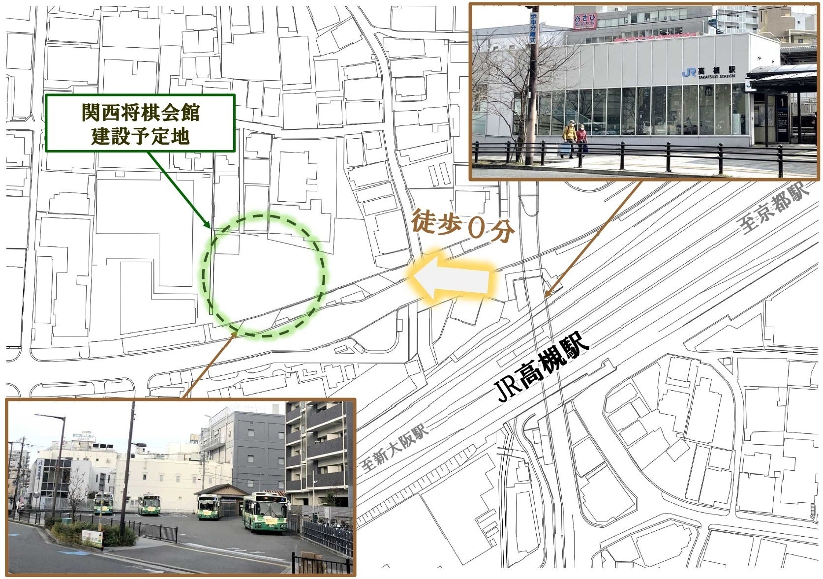 新会館は、令和5年度に大阪市福島区から高槻市に移転します。京都と大阪の中間に位置する交通利便性の非常に良いJR高槻駅西口から徒歩0分の場所となります。 現在、日本将棋連盟では、新会館建設に向け、創立100周年事業・東西将棋会館建設委員会を発足し、各種取り組みを鋭意進めているところです。