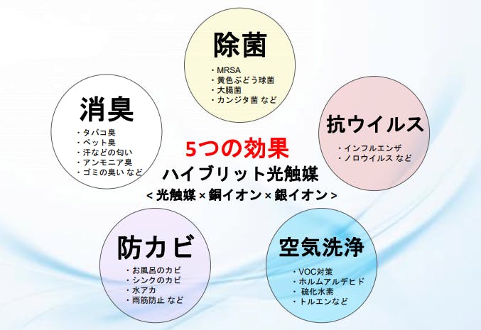 酸化チタンは紫外線を受けると酸化酵素を発生し、菌やウイルスなどを水と二酸化炭素に分解します。