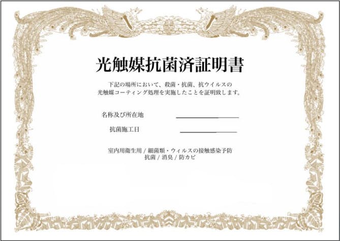 施工完了後、光触媒抗菌済み証明書発行致します!