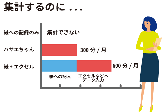 集計に関してハサエちゃんを使った場合、紙や既存ソフト(エクセル)などを使用した場合より記録作業時間が半分以上で解決します。