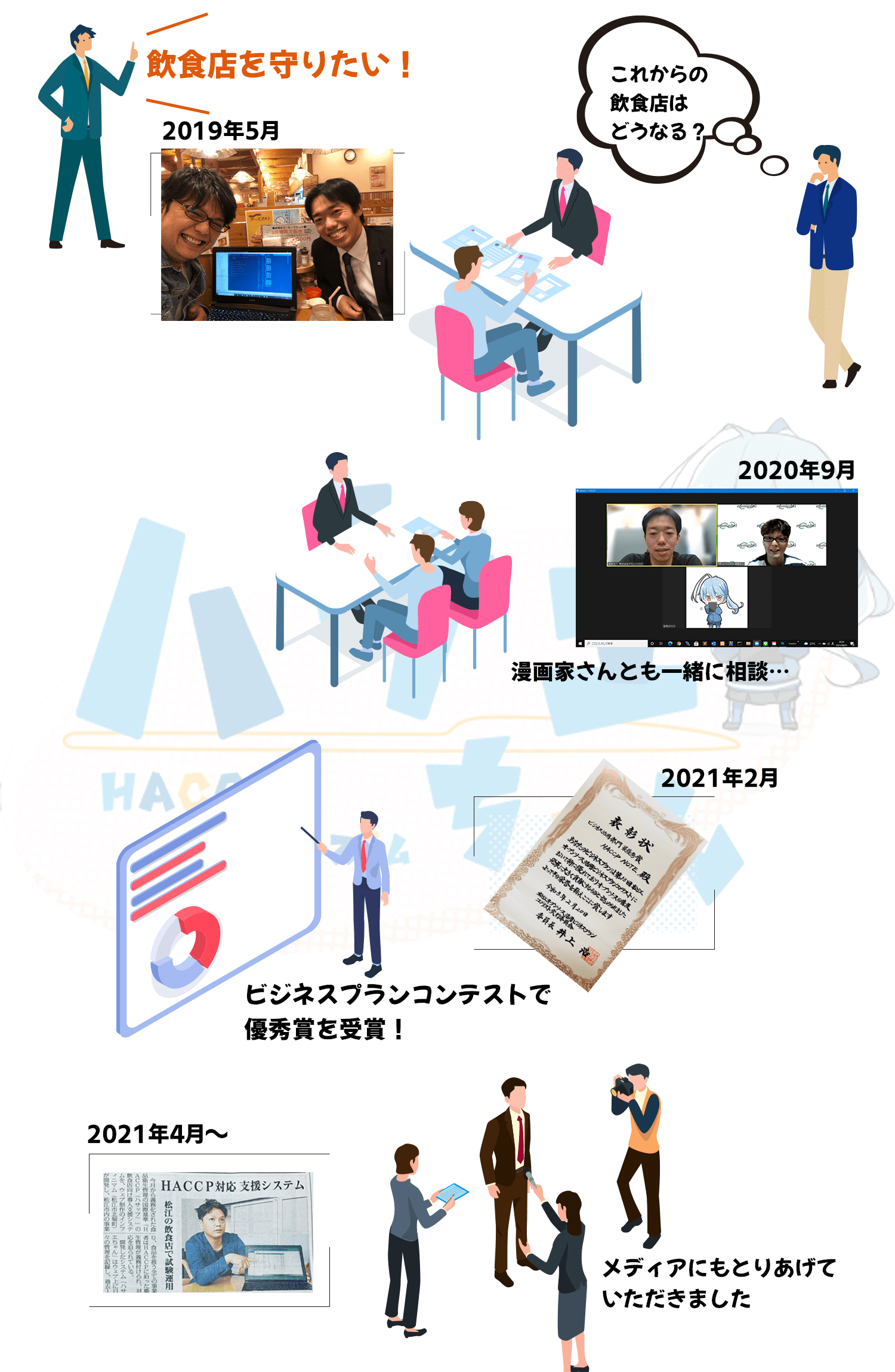 飲食店関係者の皆様が実行する一般衛生管理の手法である『HACCP※』の業務負荷を減らすことを目指し、HACCP支援システム『ハサエちゃん』の開発とHACCPを理解してもらうのに、分かりやすいようにマンガ版『ハサエちゃん』の制作を目指しています。