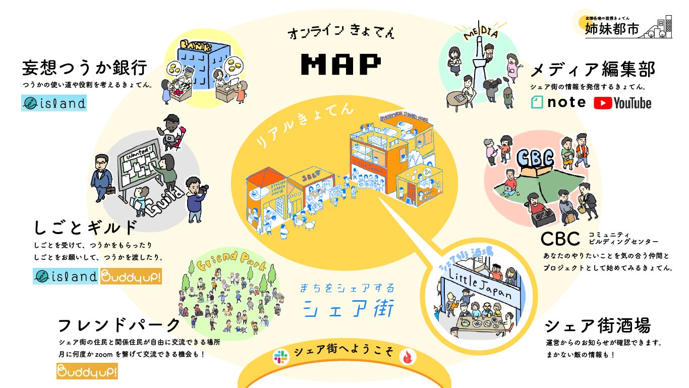 そしてシェア街の特徴として、リアルだけでなく、さらに、オンラインに15個ぐらいの「きょてん」があります。
