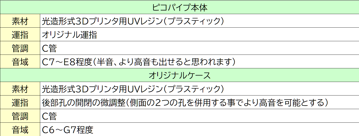 ピコパイプは、全長6.6cmの「超小型リコーダー」といった外見をしています。指穴は表に2つ、裏に1つの、計3つですが、運指では「本体お尻の穴」も使いますので、都合4つの穴がある、という事になります。全音階で1オクターブと少しとなっておりますが、これ以上の音階を表現する事も、半音階を表現することも可能だと思われます。是非、挑戦してみて頂ければと思います。