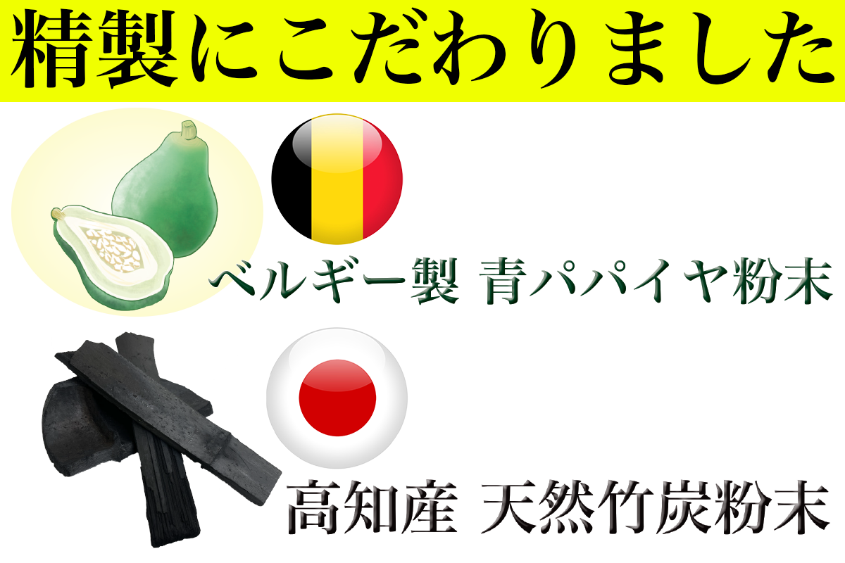 還元麦芽糖水飴(国内製造)、青パパイヤ粉末(ベルギー)、竹炭粉末(国内製造)/V.C、香料、甘味料(アスパルテーム)