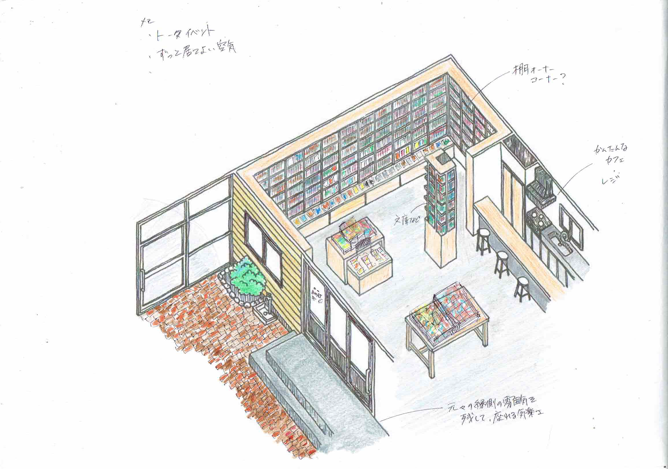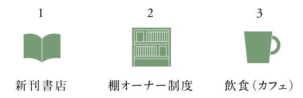 2.は書棚の一角を、東京・吉祥寺の”ブックマンション”や、静岡・焼津の”みんなの図書館 さんかく”を参考にさせて頂き、棚オーナー制度を採り入れようと考えています。月額で棚を借りてくれるオーナーさんを募集し、そこに好きな本を好きな値段で売ってもらうという、棚単位の小さな書店が集うコーナーを設けます。売上は棚オーナーに還元される仕組みです。