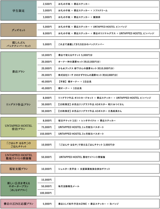ここまでで長々と語ってきた「なぜ書店をやるのか」「どんな未来を目指すのか」というUNTAPPED HOSTELの想いに、何かを感じ、少しでも共鳴して頂いた方々はもちろん、シンプルに「近所に書店があったら嬉しい」という方や、支援活動に関心を持っていただいた方々にもご協力頂けたら大変嬉しく思います。書店も宿も開かれた場所であり、だからこそ立場や考え方を超えて、皆さんと一緒に育んでいきたいと思っています。