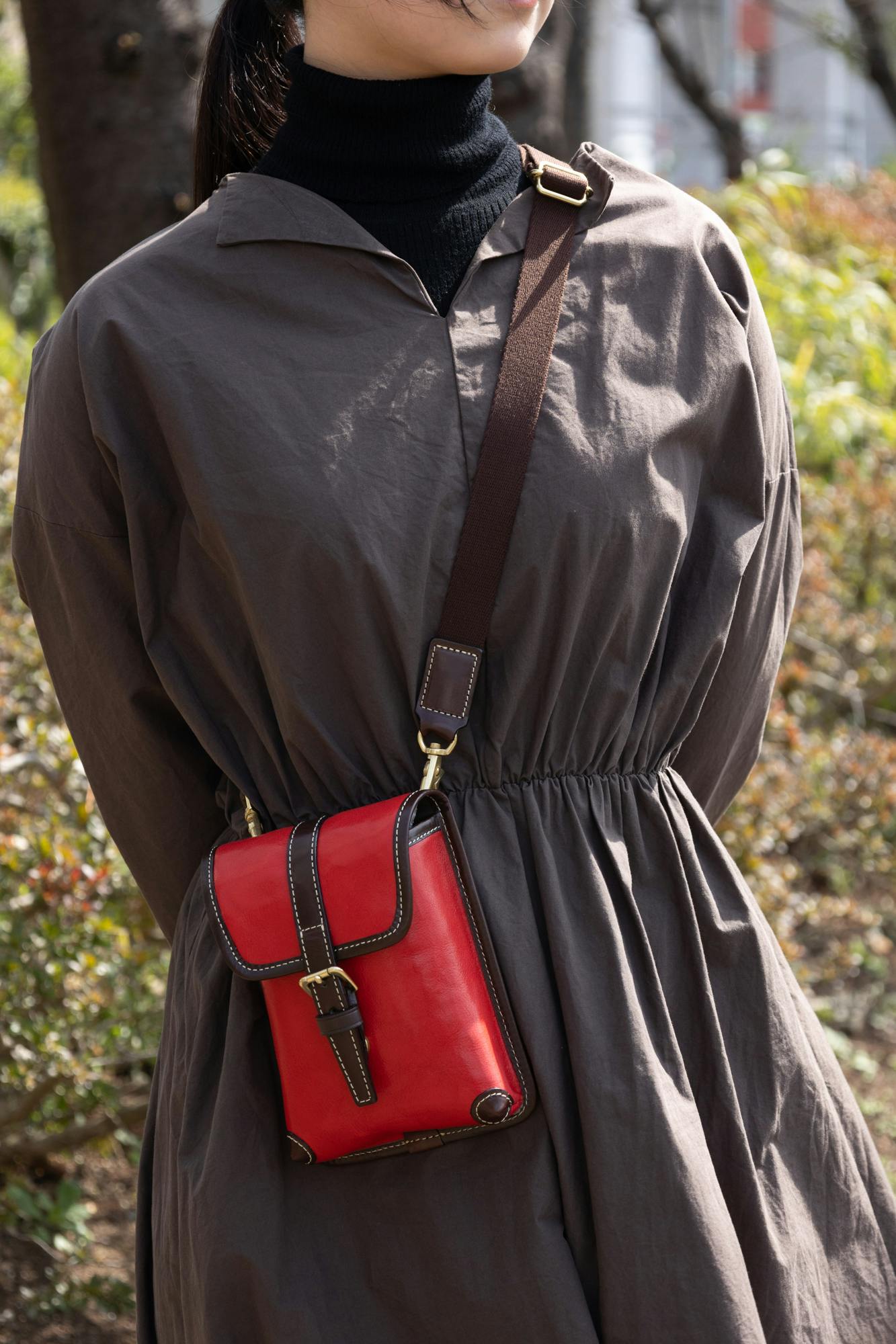 短めに胸の前でかけたり、長めにして腰にかけたり様々な持ち方がお楽しみ頂けます。