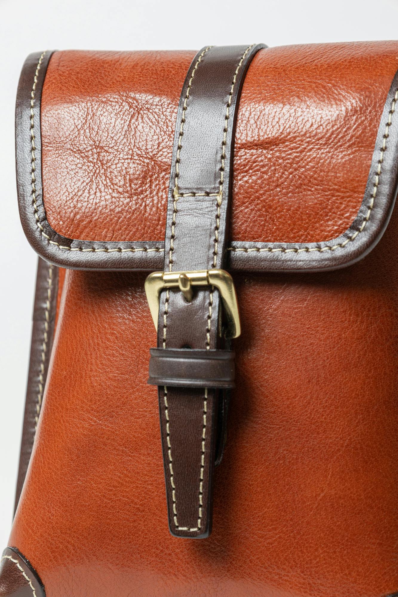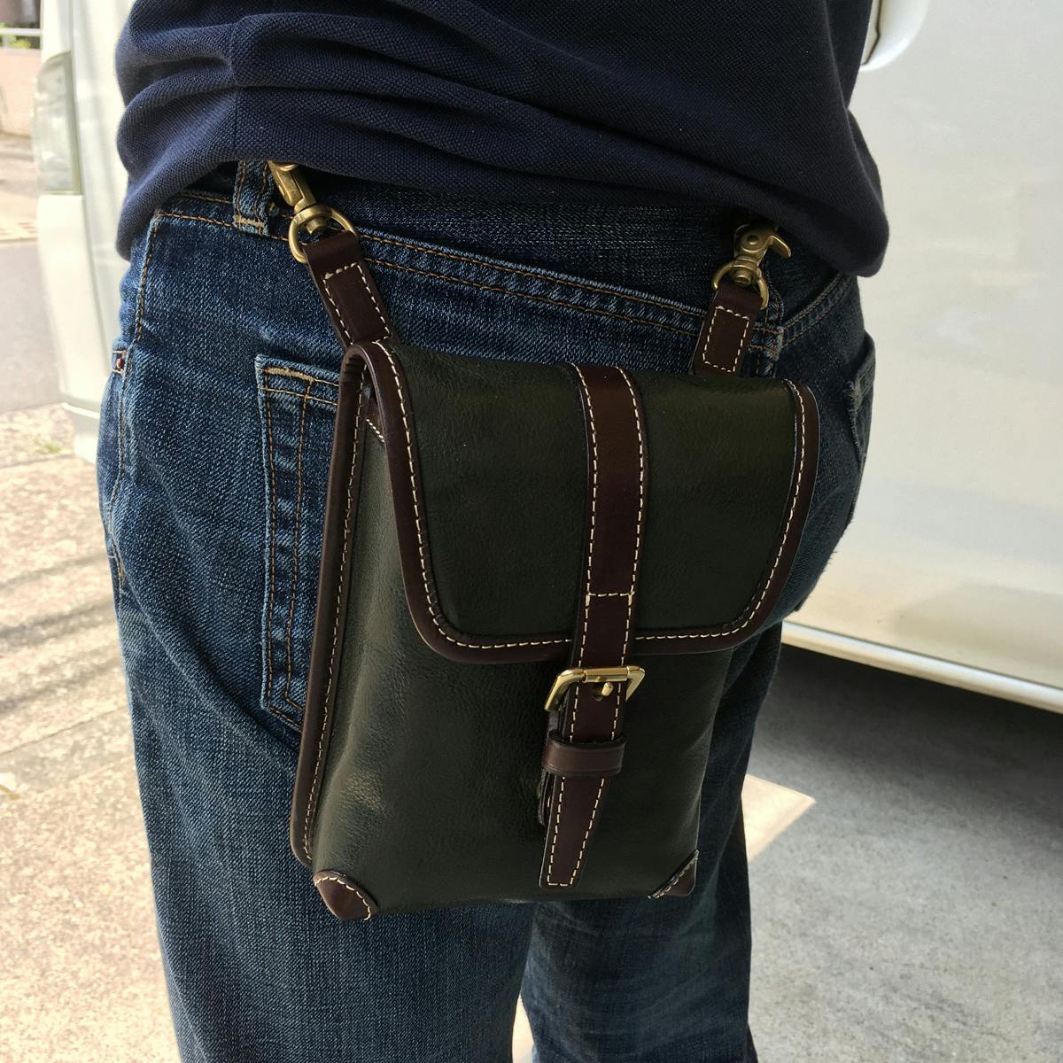 鞄の根元の革(根革)にはDカンを付けています。Dカンがある事で根革が左右に動き、可動の役割を果たします。ベルトループの幅を気にせず、お手持ちのズボンに取り付ける事が出来ます。